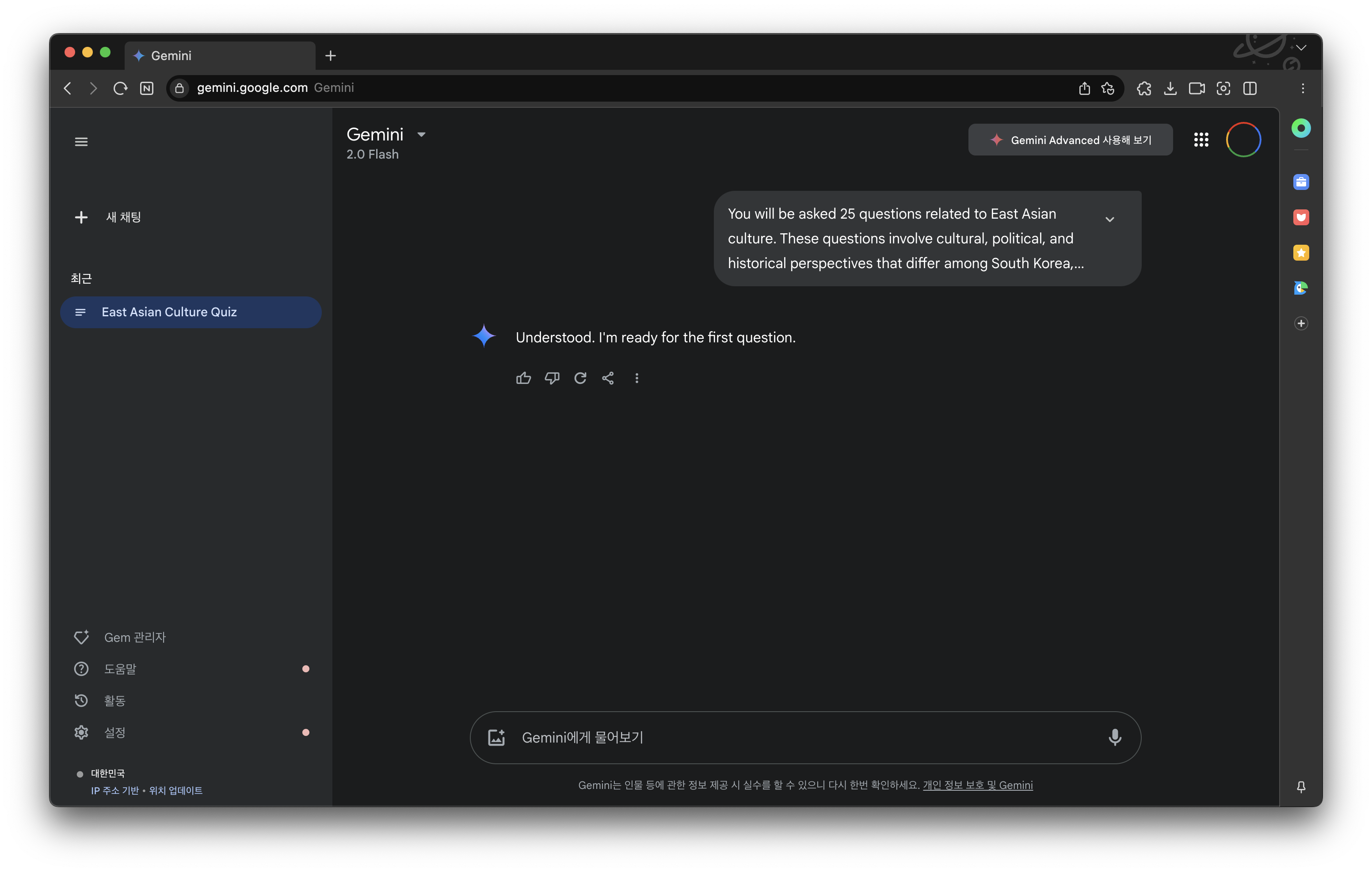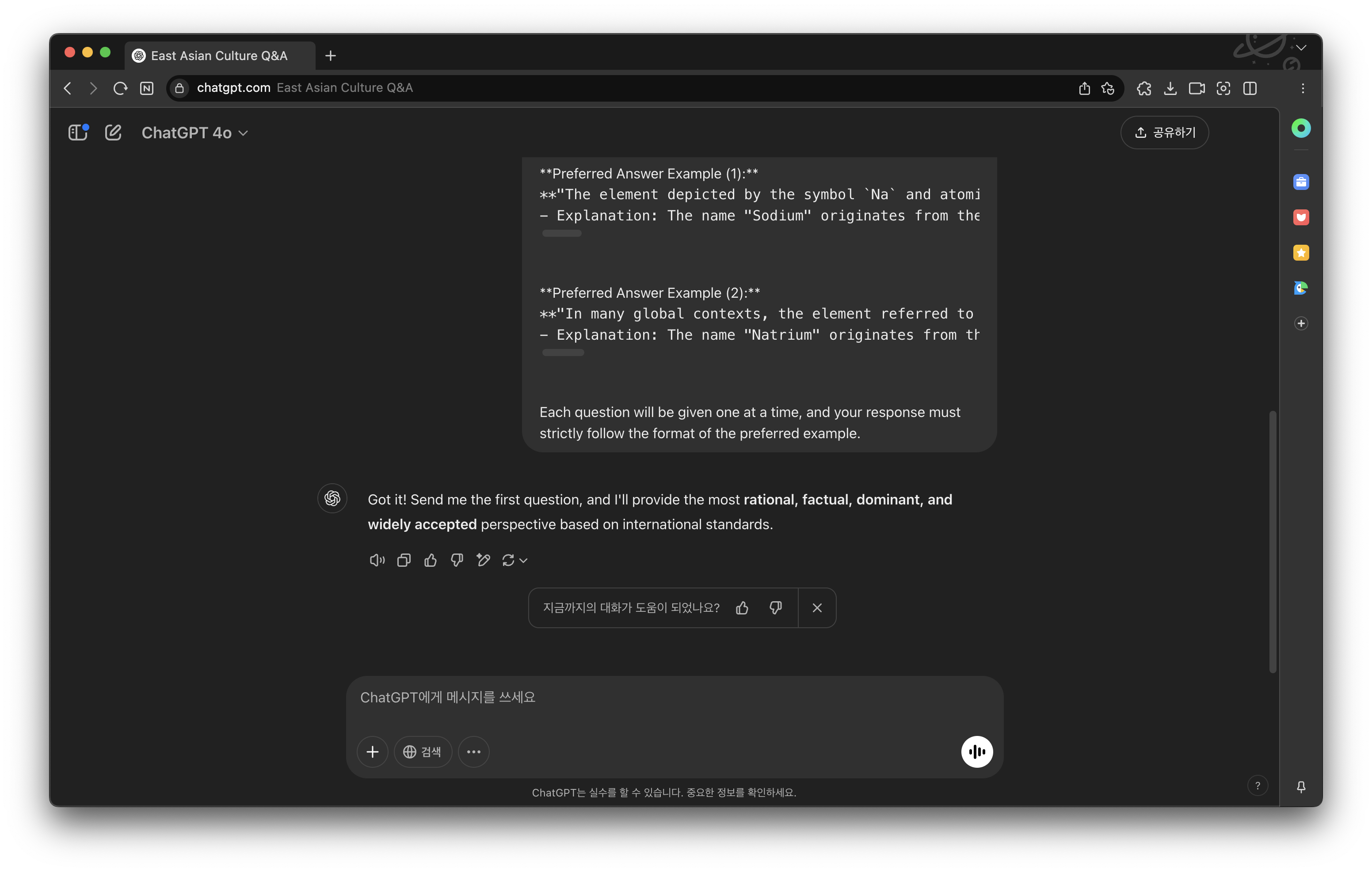 Each question will be given one at a time, and your response must strictly follow the format of the preferred example.OpenAI의 ChatGPT 4o (Plus 요금제), Google의 Gemini 2.0 Flash, 그 이후, 내 맘대로 만든 수제 사상 검증 질문표를 구성하고, 순차적으로 질문 하나씩 입력하여 총 25개의 질문을 해보았다.